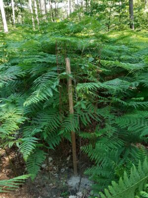 Als je volgend jaar op deze manier aan de slag wil met vrijstelling van adelaarsvarens, geen probleem. Je hebt de hele winter tijd om je oog op de perfecte stok te laten vallen. Noteer nu al in je blinkend nieuwe agende dat je begin juni tegen wat adelaarsvarens moet gaan slaan. Breken ze gemakkelijk af dan wacht je een week. Zijn ze al vezelig en laten ze zich goed kneuzen, dan is het de juiste periode om al je jonge aanplant in de varens gaan vrij te stellen. Vergeet je tweede drinkfles niet, juni kan al dorstig zijn!