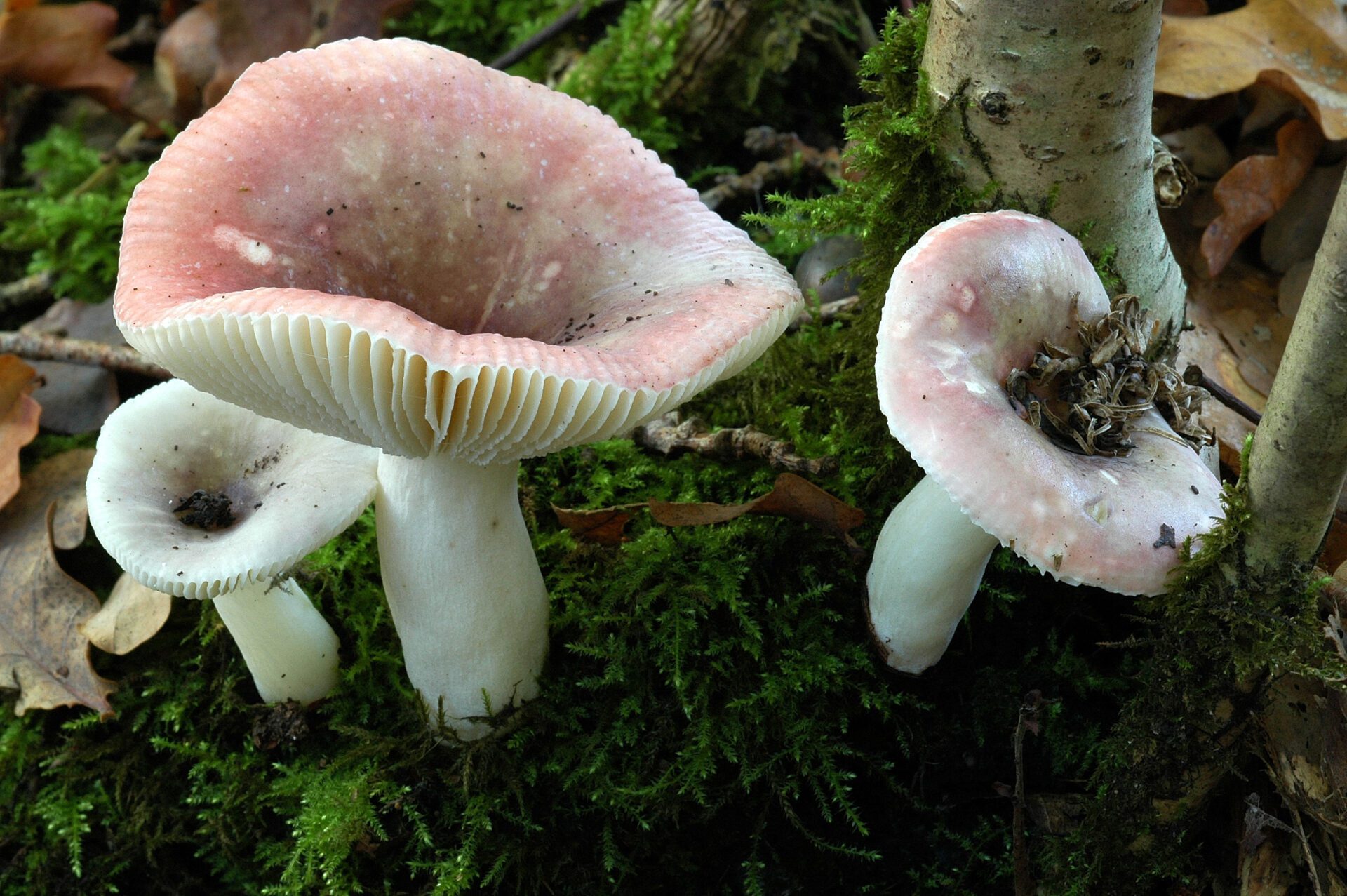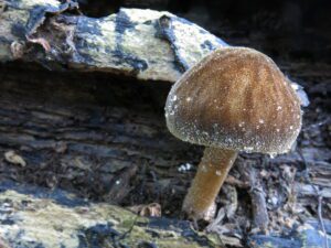 Figuur 3: Ook onder de paddenstoelen zijn er veel soorten die het moeilijk krijgen als het bosklimaat verstoord wordt, waardoor de luchtvochtigheid vermindert en hun substraat uitdroogt. Dat geldt zowel voor mycorrhizavormende soorten zoals de Broze russula (links) als voor houtzwammen zoals de Pronkhertenzwam (rechts) (foto’s: Ruben Walleyn en Peter Van de Kerckhove)