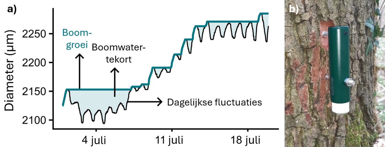 Figuur 2: (a) Typische diameterfluctuaties van een boom. Op lange termijn neemt de diameter toe door groei. Tegelijk kent de boomstam een dagelijkse cyclus van inkrimping en uitzetting, doordat de boom overdag transpireert, en ’s nachts weer water uit de bodem opneemt. (b) Een dendrometer van het gebruikte type, bevestigd aan een zomereik (Foto: Anneleen Geussens).