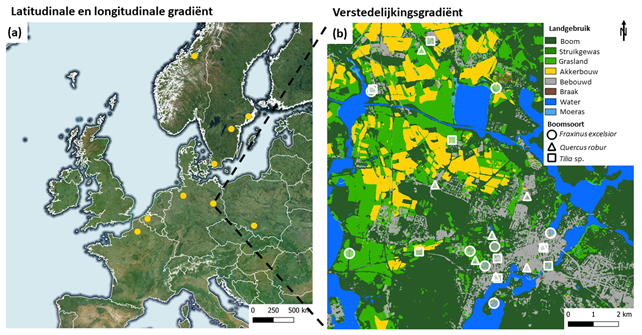Figuur 1: Overzicht van de studielocaties met (a) de negen onderzochte steden van zuid naar noord: Amiens, Tarnowskie Góry, Gent, Potsdam, Bremen, Lund, Linköping, Stockholm, en Trondheim; en (b) de onderzochte grote solitaire bomen langsheen de verstedelijkingsgradiënt in Potsdam (Oost-Duitsland) met als achtergrond het lokale landgebruik.