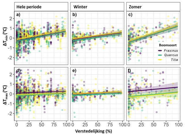 Figuur 3: De afwijking van de gemiddelde minimummaandtemperatuur (a, b, c,) en maximummaandtemperatuur (d, e, f) ten opzichte van het gemiddelde voor alle 24 bomen in de stad in relatie tot de verstedelijking in een straal van 75 m rond de solitaire boom voor (a, d) de hele studieperiode, (b, e) winter, en (c, f) zomer. Een negatieve temperatuurafwijking betekent dat de temperatuur onder de boom lager is dan de gemiddelde temperatuur onder alle bomen in de stad. Een positieve temperatuurafwijking betekent dat de temperatuur onder de boom hoger is. De grafiek toont temperatuurvoorspellingen samen met het 95%-betrouwbaarheidsinterval per boomsoort.