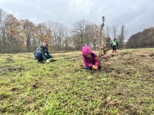 In totaal plantte het team die dag 13 verschillende soorten, waaronder winter- en zomereik, zomerlinde, zwarte els en een brede variatie aan struiksoorten. De plantgaten waren een week eerder al geboord, maar voor de boompjes met grotere wortels bleken de spades toch onmisbaar om voldoende ruimte te creëren. Bijna 2500 boompjes kregen hier hun plek op 1,72 hectare. Het gaat onder andere om boompjes die het afgelopen jaar geschonken werden, en dat merkten ze: wie een boompje gaf of kreeg, stond te popelen om het zelf te komen planten.