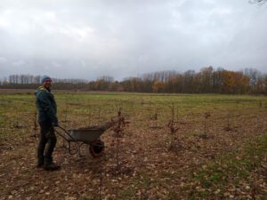 De eerste enthousiaste planter – iemand uit de buurt – stond zelfs al een uur voor de officiële start klaar om te helpen. Dat kwam goed van pas, want Annelies en Kurt waren volop bezig met het ‘uitkuilen’ van het bosgoed. Alle boompjes waren de woensdag ervoor geleverd en tot het plantmoment volgens de regels ingekuild, zodat de wortels goed beschermd bleven tegen weer en wind.