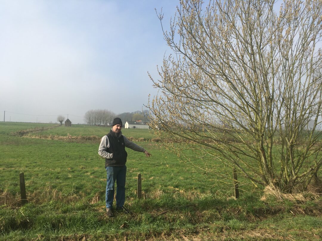 Tijdens het terreinbezoek aan het perceel waar we een houtkant zullen aanleggen binnen dit project, wijst Simon naar een prachtig bloeiende wilg. ‘Dankzij wilgen op de perceelsranden kunnen wilde bijen hier ook voedsel vinden vroeg in het seizoen, als er nog niet veel andere planten in bloei staan’. Simon gaat verder: ‘Ik vind houtkanten aanplanten langs mijn velden logisch om te doen, het is een mooie samenwerking tussen landbouw en natuur’.